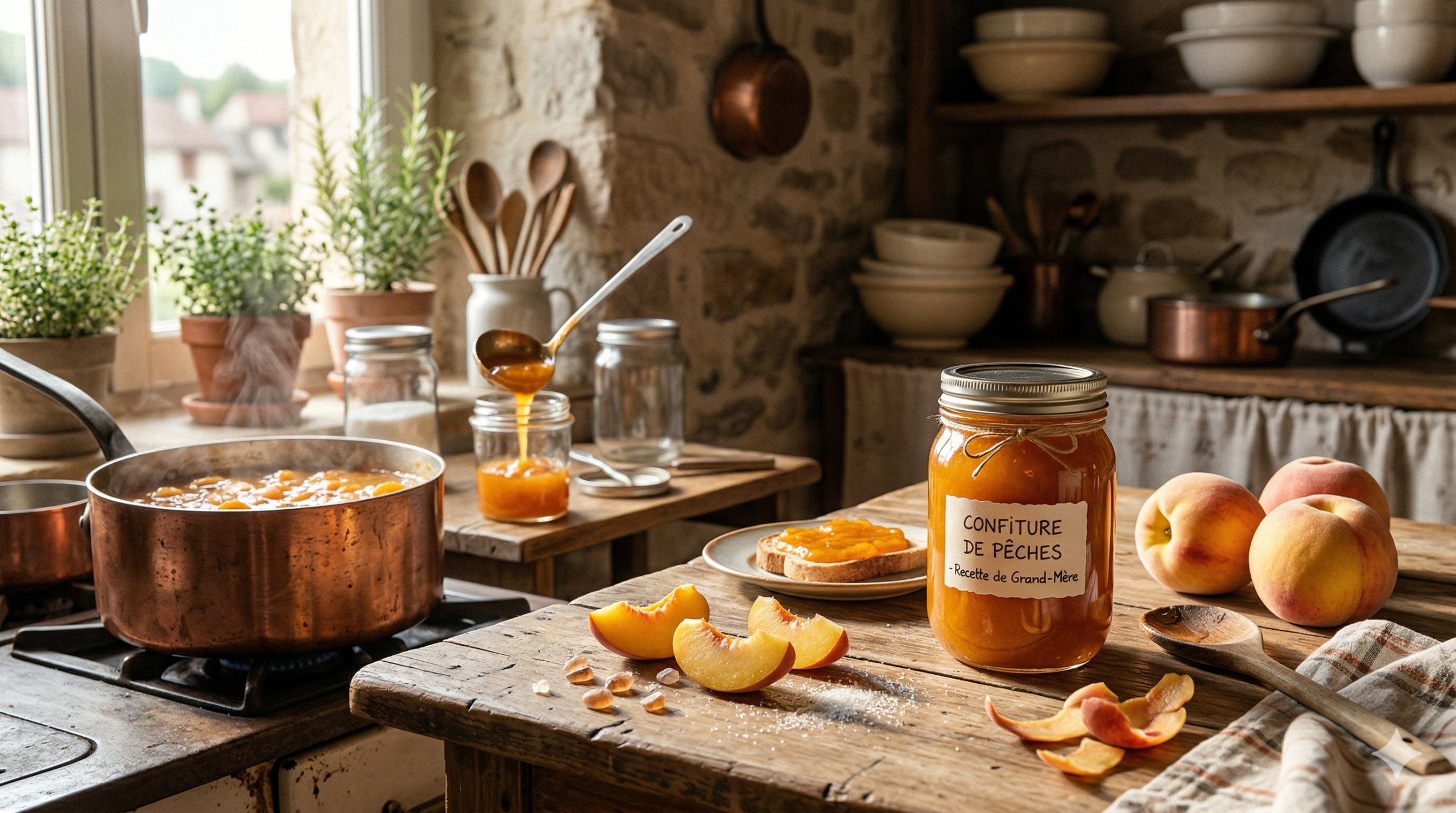 La confiture de pêches recette de grand-mère se prépare avec seulement 3 ingrédients : des pêches bien mûres, du sucre et du citron. Résultat : un pot généreux, parfumé, et fidèle aux gestes d’autrefois.