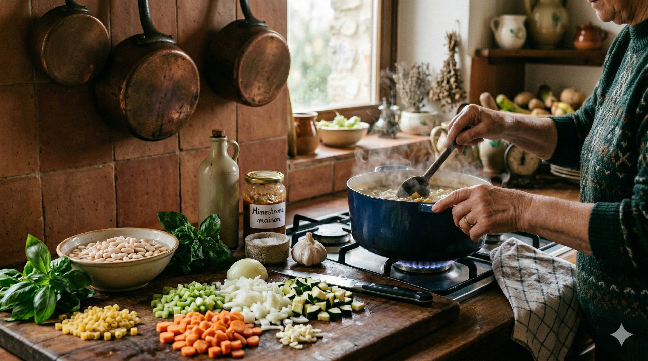 Le minestrone est une soupe italienne épaisse, riche en légumes, en haricots et souvent en pâtes ou en riz. Son nom vient de l’italien et signifie littéralement "grande soupe". L’idée est simple : on met beaucoup d’ingrédients dans une même marmite. Le résultat est un plat complet, nourrissant et économique. Ce n’est pas une recette figée. C’est une recette vivante, adaptée à ce qu’on a sous la main. Et c’est précisément ce qui lui donne son caractère de "cuisine de grand-mère" : elle est juste, simple et généreuse.